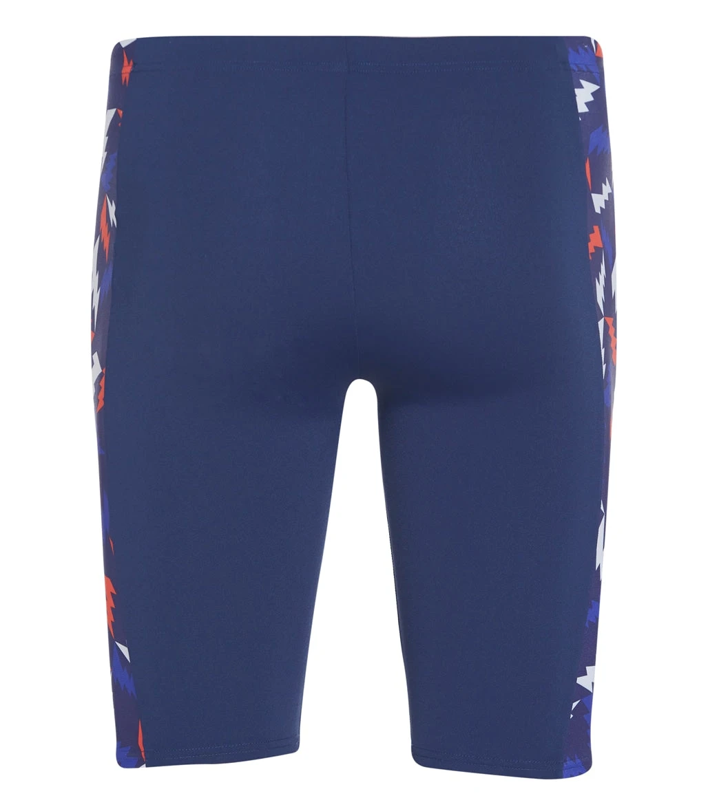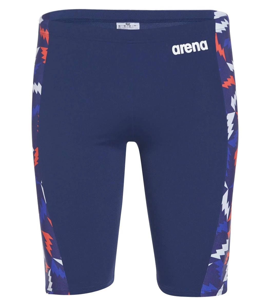 The Arena Men’s Lightning Colors Jammer Swimsuit features an electric print and a chlorine-resistant construction for long practice days in the pool.