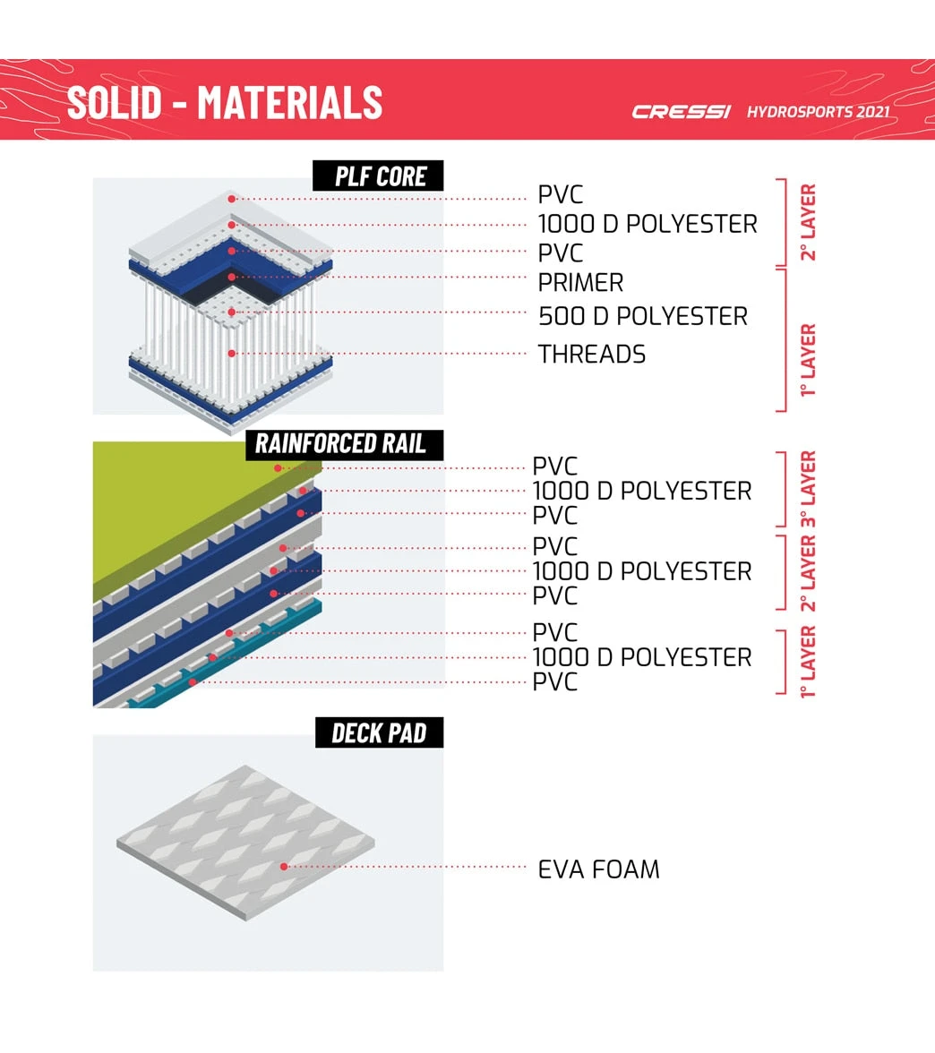 Cressi Solid Tandem Dc 12’2” ISUP is the first SUP specifically conceived for Water Sports Centers and Rental activity. The use of Double Chamber Reinforced PLF technology and triple-layer anti-abrasion rail (the most resistant and robust composition in the whole collection) guarantees maximum structural rigidity and great safety during sessions at sea.