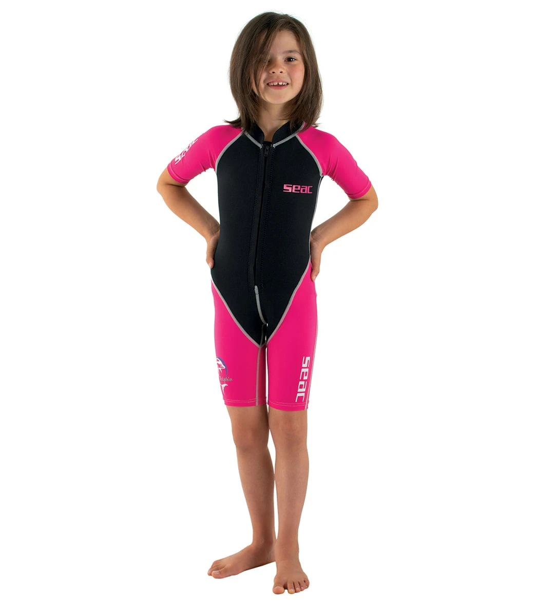 The Seac USA Girls’ 1.5mm Short Sleeve Dolphin Springsuit Wetsuit is perfect for swimming, snorkeling, and exploring the sea with parents, or simply playing in the water in complete safety.