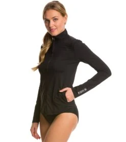 - 1/2 zip on the upper back with a protective flap and pull tab
