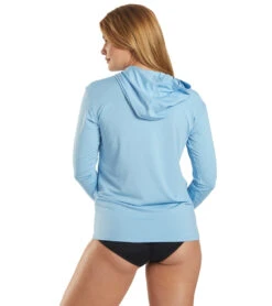 Workout outdoors in the TYR Women’s SunDefense Long Sleeve Hooded UPF 50+ Swim Shirt featuring sun protective fabric.