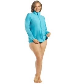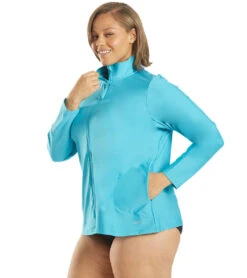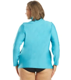 Paddleboard with style in the Block the Sporti Women’s Plus Size L/S Zip Front UPF 50+ Rashguard. Has a high neck for extra coverage and an exposed full zipper for easy on-and-off.